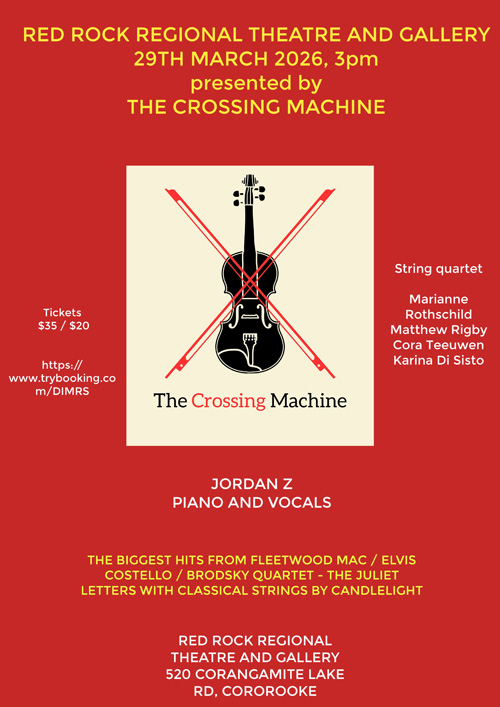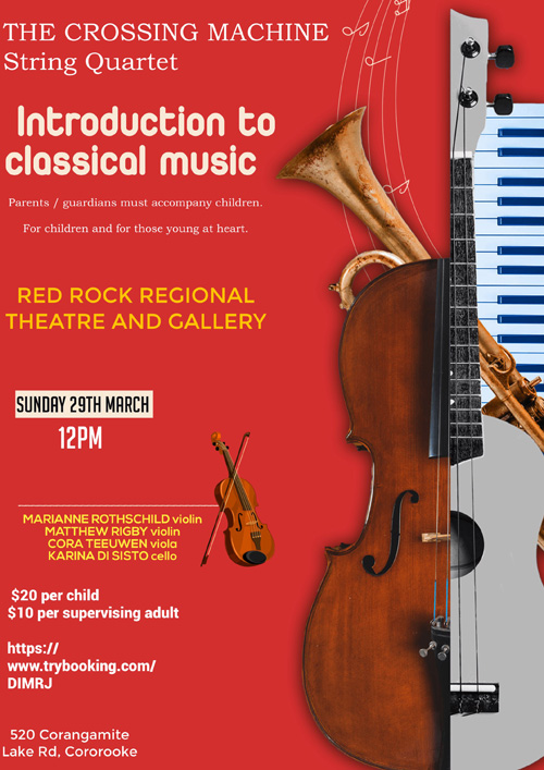 The Crossing Machine String Quartet will present “Introduction to Classical Music” at the Red Rock Regional Theatre and Gallery, 520 Corangamite Lake Rd, Cororooke on Sunday 29th March, 2026 at 12 noon. This will be a delightful afternoon concert for children and those young at heart.
